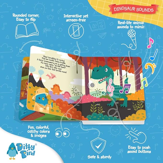 - ๐ฆTime to rawr Dino lovers: Let your kids enjoy listening & learning about Dinos with this Ditty Bird books with sound featuring 6 different dinosaurs & the sounds they make! Whether your little boy or girl is a Triceratops, Stegosaurus, T-Rex, Brontosaurus, Velociraptor fan, they'll surely love these toddler books!
