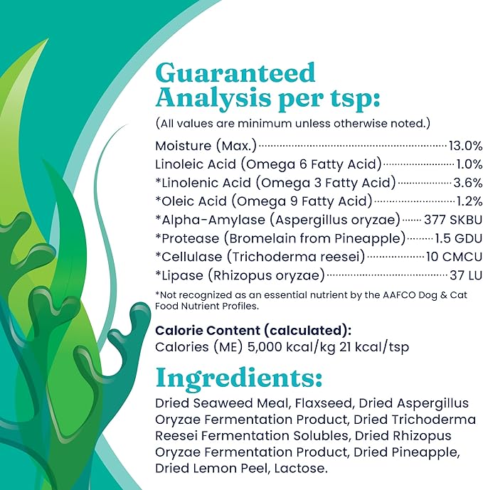 - Digestive Health Support – This kelp-based dog supplement powder has digestive enzymes for gut health, nutrient absorption & regularity. A top choice for gut supplements for dogs, pet vitamins and supplements, dog food additive & dog dental powder