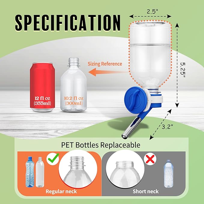 - ๐พ Mini-Sized Nozzle (10mm) is recommended for Guinea Pig, Ferret, Hamster, Bunny. / Made of BPA Free Material/ 10.2 oz Capacity.