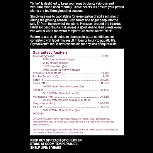 - Easy & Safe Application -- When used monthly, Thrive pellets ensure your outdoor potted pond plants are fed throughout the season. Safe for fish, koi, goldfish, frogs, snails, and other aquatic life.
