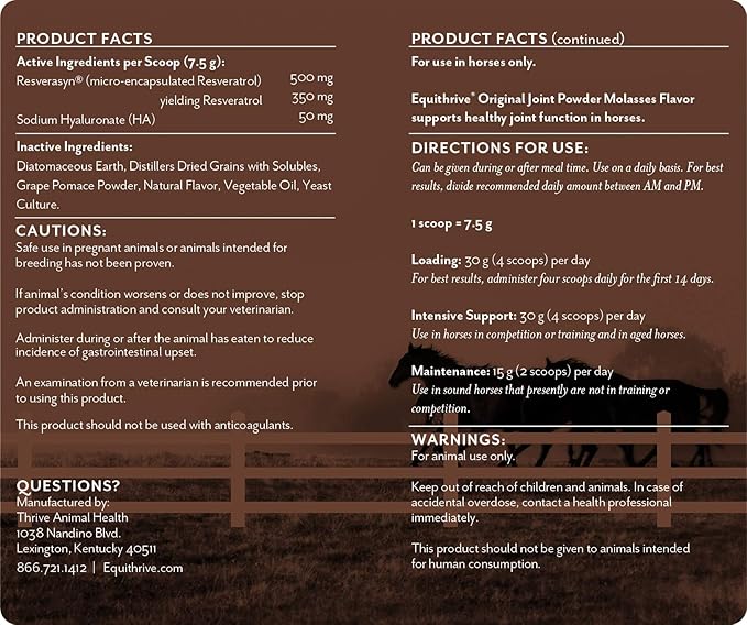 - SUPPORTS SOUNDNESS - Equithrive Original Joint Powder Molasses Flavor, fortified with Resveratrol and Hyaluronic Acid, supports soundness and mobility in horses. This joint supplement for horses is designed to support joints during training, competition and aging.