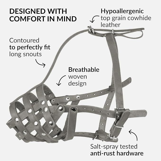 - COMFORTABLE: Our high-quality, handmade leather dog muzzle is skin-friendly. With a cross-weave design, this breathable, durable muzzle is soft on your dogโs fur because your petโs comfort always comes first.