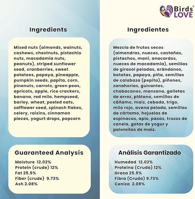 - No added preservatives nor sweeteners: natural sweet fruits to maintain healthy skin, muscles, and feathers