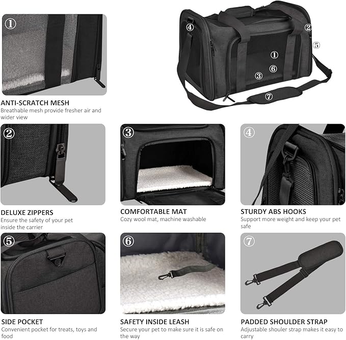 - DURABLE - This cat carrier is made of durable and lightweight polyester fabric. The four-side mesh will not only give a safe and comfortable travel for your pet, but also easy for you to check on your pet