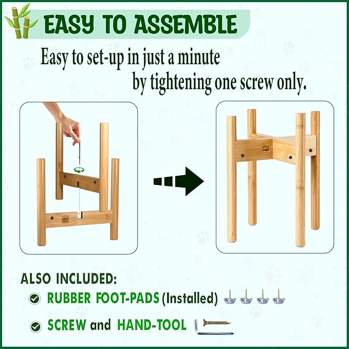 - Raises Bowl to Around 14" High – When a bowl is placed on the bamboo stand, the height of the elevated bowl will become approximately 14 inches tall from ground to bowl rim. Please see photos for measurement and set up. [Bowls shown in the photos are sold separately.]