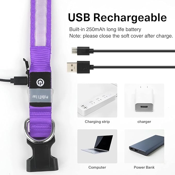 - ➤ Rechargeable Led Dog Collar - PcEoTllar dog collar is waterproof. No worries about the collar when your dog is swimming or playing under the water! Please close the Soft Charging Cover after charging and please stay away from sea-water. Rechargeable with any other daily USB device is more convenient, you will not paying for batteries anymore! Full power can last 10 hours.