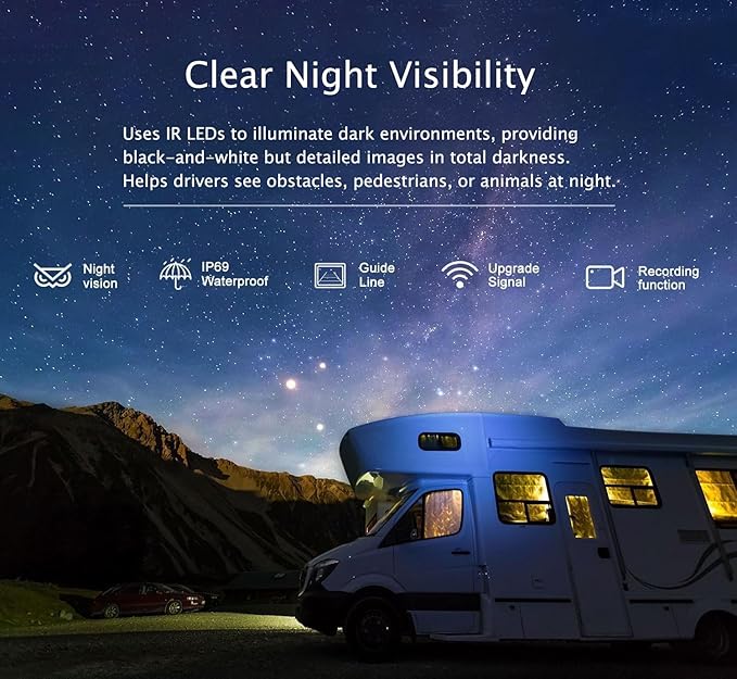 - ☆【Night Vision & IP69 Waterproof】 Equipped with infrared illumination and a high-sensitivity CMOS sensor, this rear view camera delivers exceptional night vision capability - clearly identifying obstacles, pedestrians, or animals at night. The metal-sealed, IP69 waterproof housing ensures reliable performance in rain, snow, and fog, providing real-time monitoring protection for your vehicle.