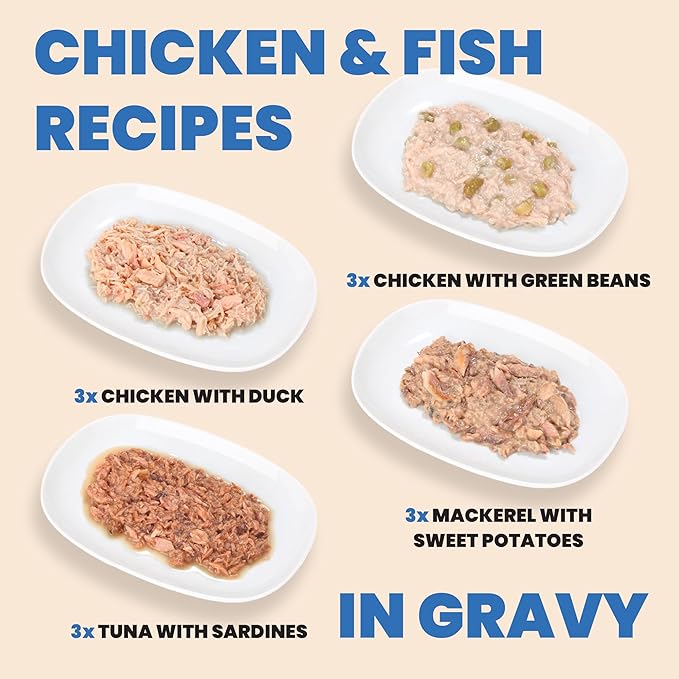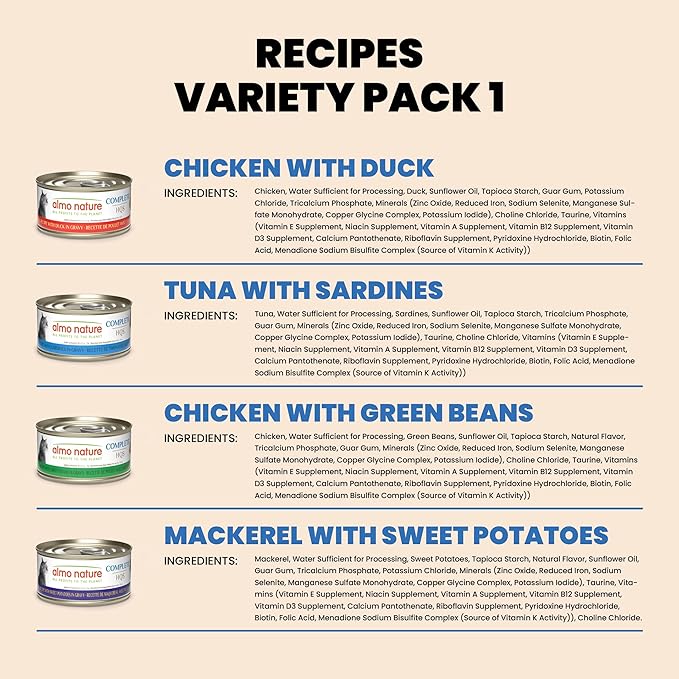- PREMIUM, HUMAN-GRADE INGREDIENTS β Our Wet Cat Food is made with HQS meat and fish as the first ingredient, originally fit for human consumption, now crafted exclusively for pets. With tuna, chicken, duck, sardines, green beans, mackerel & sweet potatoes.