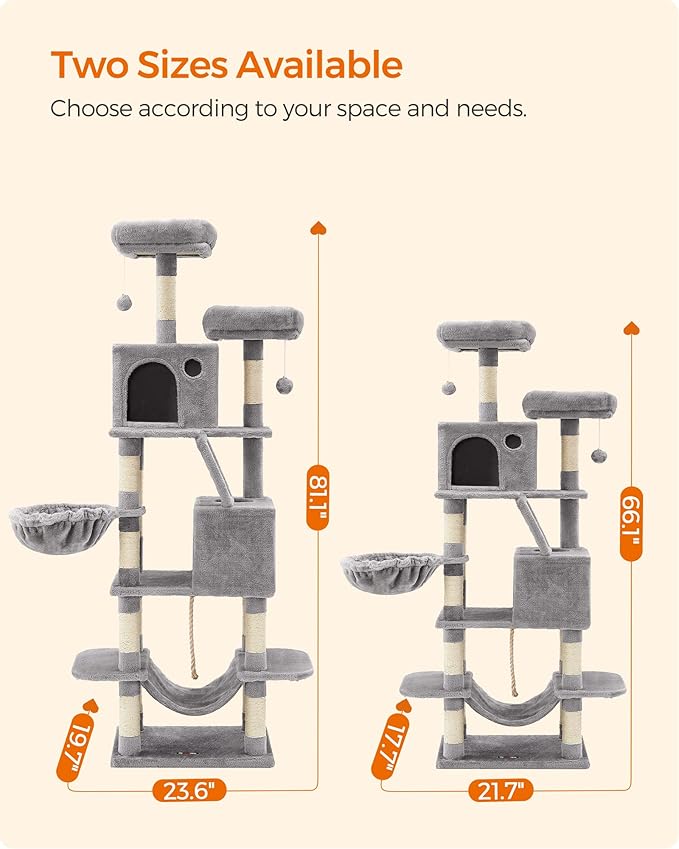 Feandrea Cat Tree, 81.1-Inch Large Cat Tower with 13 Scratching Posts, 2 Perches, 2 Caves, Basket, Hammock, Pompoms, Multi-Level Plush Cat Condo for Indoor Cats, Light Gray UPCT190W01