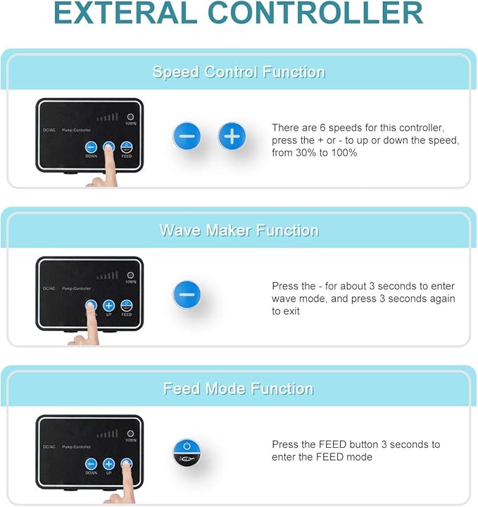 - DC controllable water pump:6 speed adjustable,control the flow from 30% to 100% of max flow,with 10 minutes feeding mode and wave maker function;
