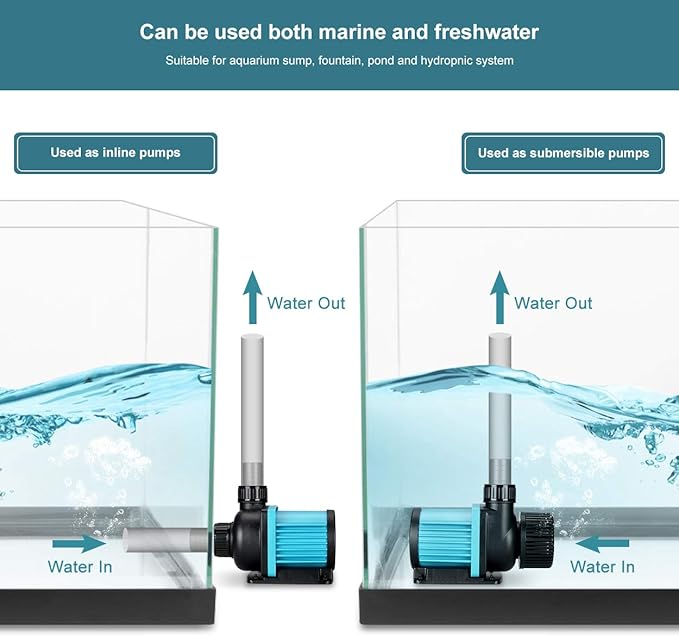 - Wide applicaion DC pump: can be used as salt water or fresh water aquarium sump pump, fountain pump,hydroponics pump and waterfall pump;can be used as external/inline or submersible pump;