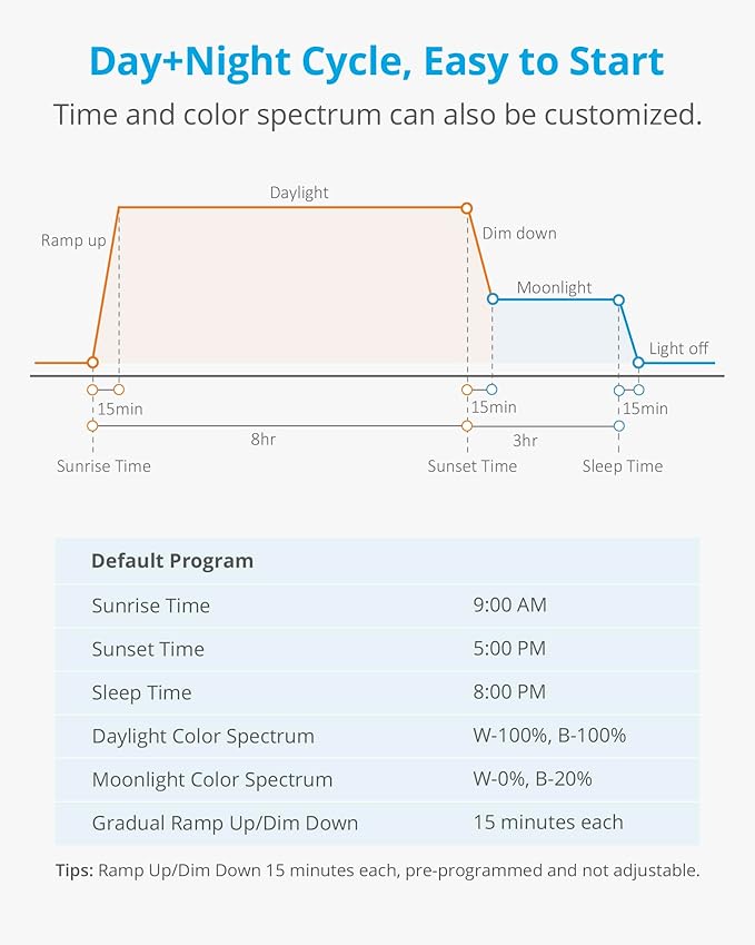 - For greater customization, the brightness of the blue and white LEDs can be adjusted independently from 0% to 100%. 15 minutes ramp-up and ramp-down to make creatures better adapt to changes in lighting effects