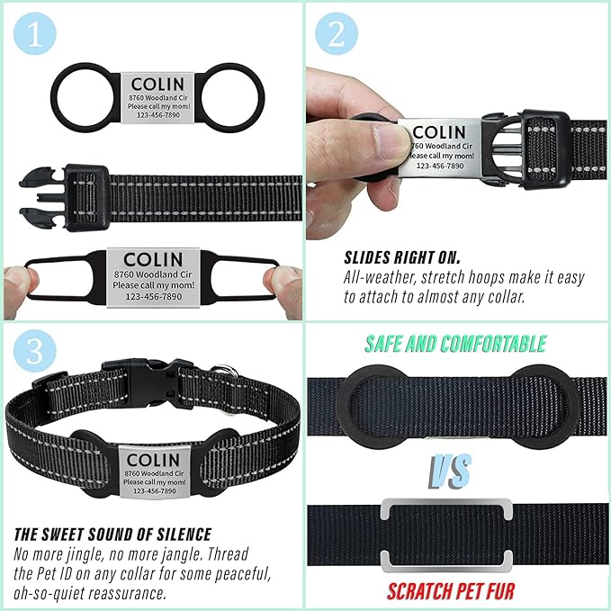 - 🐶 Silent, Durable, And Lightweight Dog Tags: Made from rustproof stainless steel & silicone, our pet tags for dogs and cats will stand the test of time. The easy, slide-on design makes our pet ID tag silent and ideal for puppies and kittens.