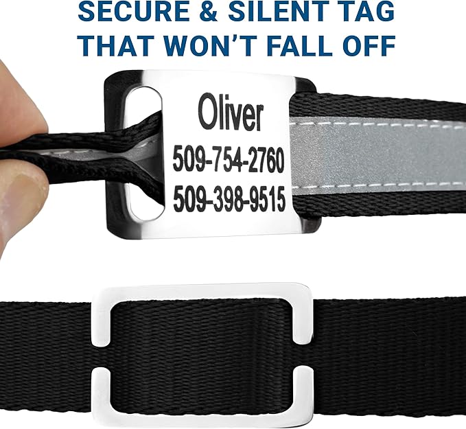 GoTags Reflective Personalized Dog Collar with Nameplate, Adjustable Dog Collar with Custom Engraved Steel Slide On Pet ID Tag, Silent, No Noise Dog Tag for Large Medium or Small (Black, Small)