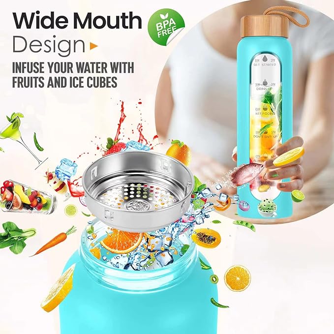 Aqulea Glass Water Bottles 32 Oz with Silicone Sleeve - BPA Free Reusable Wide Mouth Glass Motivational Water Bottles with Fruit Infuser – Leak Proof Borosilicate Water Bottle with Time Marker (Teal)