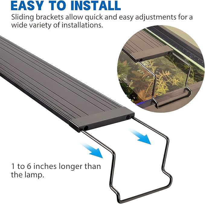 - Ultra-Slim Aquarium Light: The fish tank light is lightweight and thin. The elegant appearance will decorate your fish tank. It also can be used in really tight spaces because of the slim design. Aluminum alloy housing has fast heat dissipation and is more durable for a longer lifetime. Extendable Brackets: The led aquarium light comes with extendable bracket to fit for more fish tanks. Extendable brackets allow easy and fast adjustment for installation.