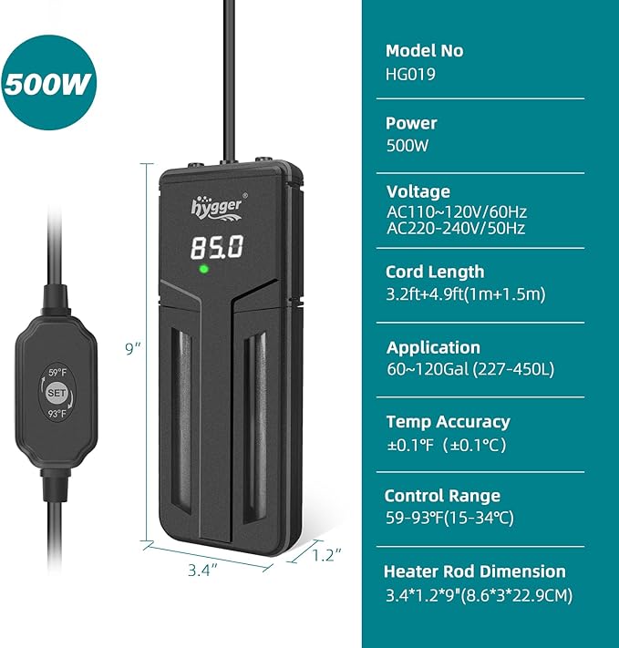 • STRONG SAFETY PERFORMANCE: Build-in intelligent LED digital temperature display. Built-in three temperature probe, real-time monitoring of water temperature, temperature accuracy of 1 ยฐF. Strong suction cup bracket, can stably fix the heater in every corner of the fish tank. Suitable for freshwater and saltwater