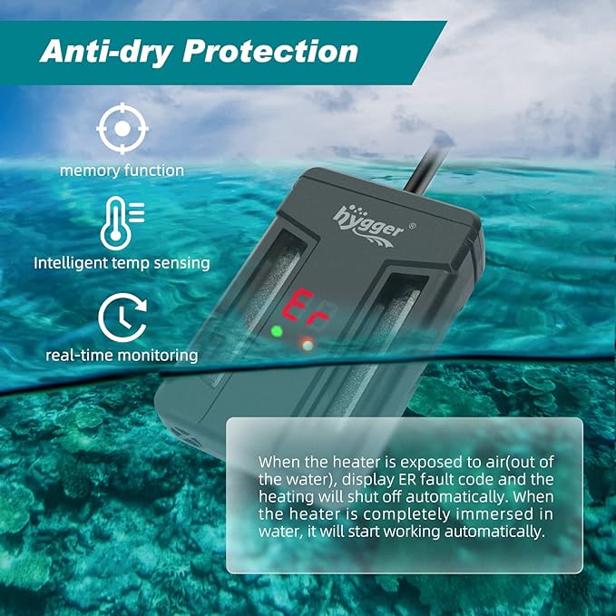 - ANTI-DRY PROTECTION: Intelligent temp sensing, when the heater is exposed to air, display ER fault code and the heater will shut off automatically. When the heater is completely immersed in water, it will start working automatically. Effectively extend the service life. It has a power-off memory function and no need to set it again