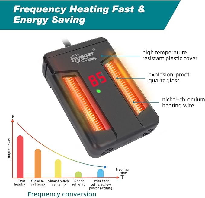- 🐠SAFE AND ANTI-BURN: The nickel-chromium heating wire materials has higher thermal energy efficiency, and then conducts heat through silicon carbide material, which effectively utilizes electrical energy to convert into thermal energy, with long service life and uniform heating, with quartz glass material, safe explosion-proof and anti-burn. The exterior high tempe resistant plastic cover, not easy to deform