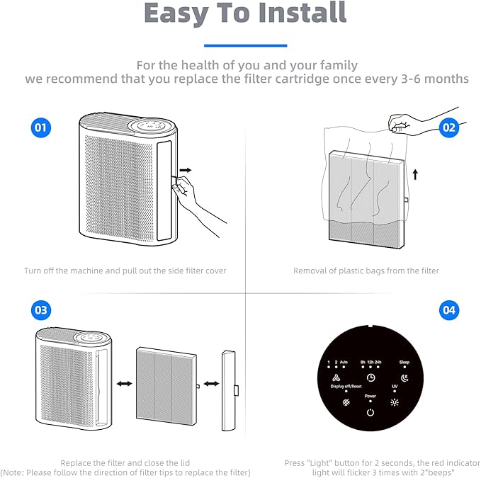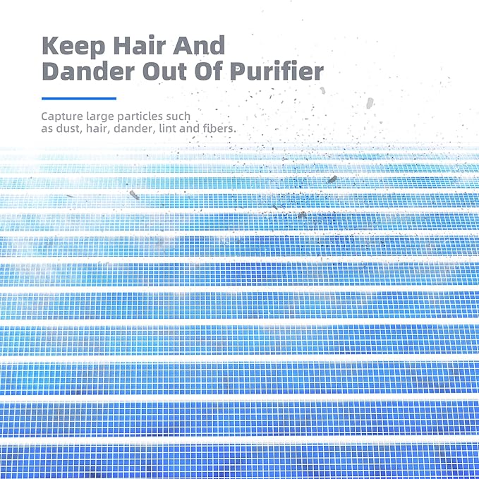 - Prevent Clogging: When hairs, dander, and other large particles meet the pre-filter layer, they will be captured them and keep it outside to prevent the air purifier from clogging.