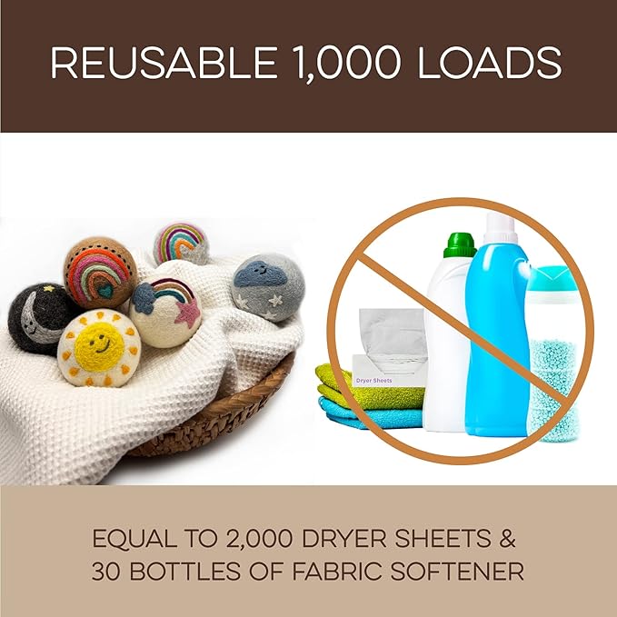- REUSABLE FOR 1000+ LOADS โ REDUCE WASTE: Why keep buying disposable dryer sheets? These cute dryer balls last 1000+ loads, replacing 2000 dryer sheets or 30 bottles of fabric softener. Fluff Ewes dryer wool balls laundry reusable deliver a cost-effective solution for 2-4 years of hassle-free laundry. Make a smarter choice for your wallet and the environment.