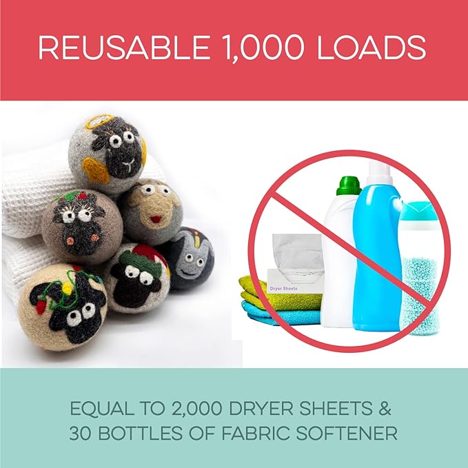 - REUSABLE FOR 1000+ LOADS โ REDUCE WASTE: Why keep buying disposable dryer sheets? These cute dryer balls last 1000+ loads, replacing 2000 dryer sheets or 30 bottles of fabric softener. Fluff Ewes dryer wool balls laundry reusable deliver a cost-effective solution for 2-4 years of hassle-free laundry. Make a smarter choice for your wallet and the environment.