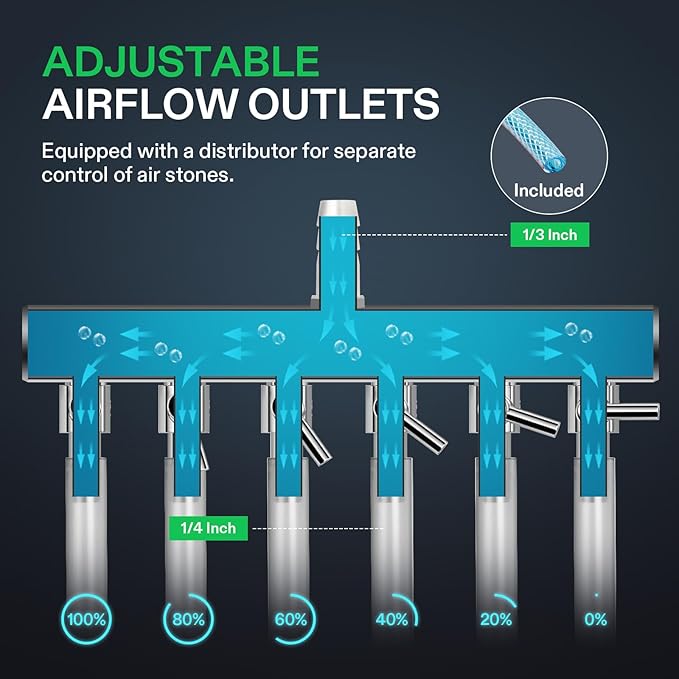 - Powerful Airflow: VIVOSUN's 15W electromagnetic motor delivers exceptional air pressure up to 0.02 MPa and a high volume of air through 6 adjustable valve outlets, compatible with 1/4" airlines