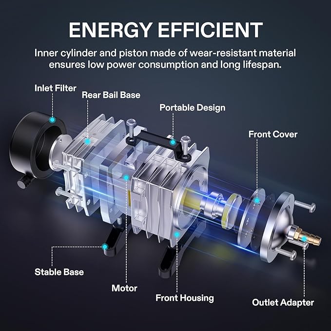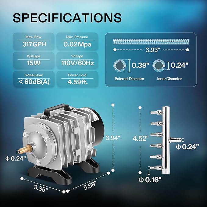 - Quiet Operation: Oil-free lubrication and low noise (under 60 dB), makes it an ideal choice for peaceful oxygenation in aquariums and hydroponic systems
