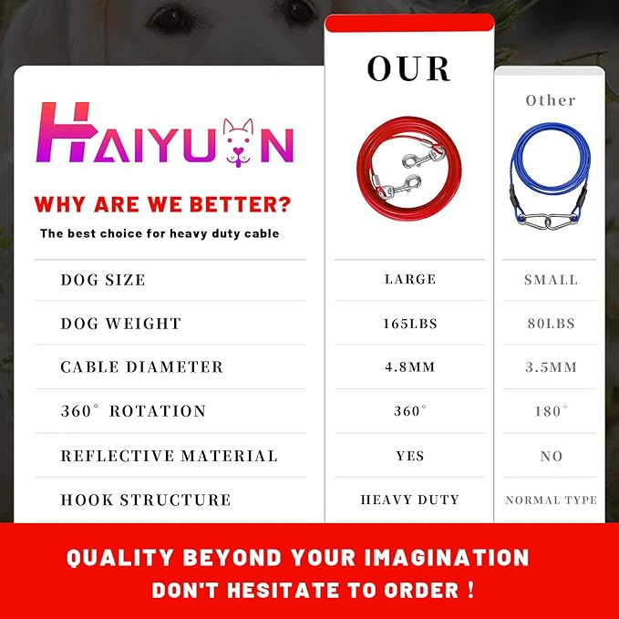 - STURDY DOG TIE OUT CABLE:The HaiYUAN multi-functional, multi-size, ultra-tensile pull cable provides greater range of motion for dogs. Designed for large, medium and small dogs up to 165 lbs.