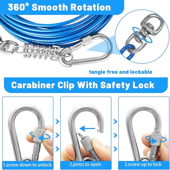 - THE NEWTEST CLIP: The rotating clip can rotate 360 ยฐ, and the clip is fixed with a ring at the bottom,so that the dog leash will not fall off the hook easily. Provide more space for dogs to move without entanglement. The screw on the swivel hook can lock it to prevent your pet from escaping from the cable and running to dangerous places. pet from breaking free of the cable and running into harm's way.