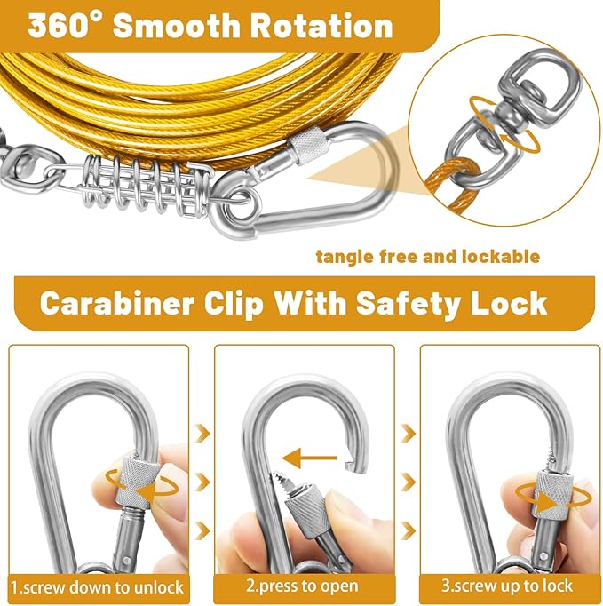 - THE NEWTEST CLIP: The rotating clip can rotate 360 ยฐ, and the clip is fixed with a ring at the bottom,so that the dog leash will not fall off the hook easily. Provide more space for dogs to move without entanglement. The screw on the swivel hook can lock it to prevent your pet from escaping from the cable and running to dangerous places. pet from breaking free of the cable and running into harm's way.