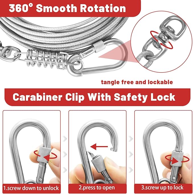 - THE NEWTEST CLIP: The rotating clip can rotate 360 ยฐ, and the clip is fixed with a ring at the bottom,so that the dog leash will not fall off the hook easily. Provide more space for dogs to move without entanglement. The screw on the swivel hook can lock it to prevent your pet from escaping from the cable and running to dangerous places. pet from breaking free of the cable and running into harm's way.