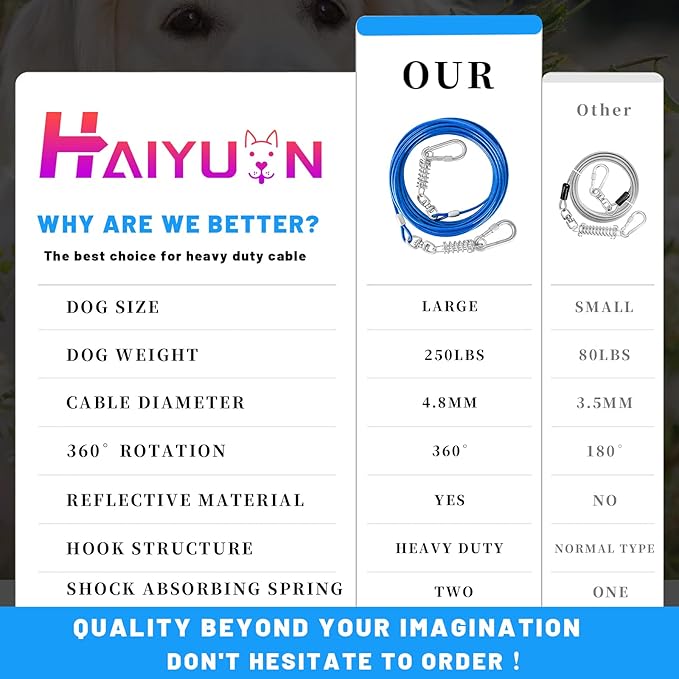 - STURDY DOG TIE OUT CABLE:The HaiYUAN multi-functional, multi-size, ultra-tensile pull cable provides greater range of motion for dogs. Designed for large, medium and small dogs up to 165 lbs.
