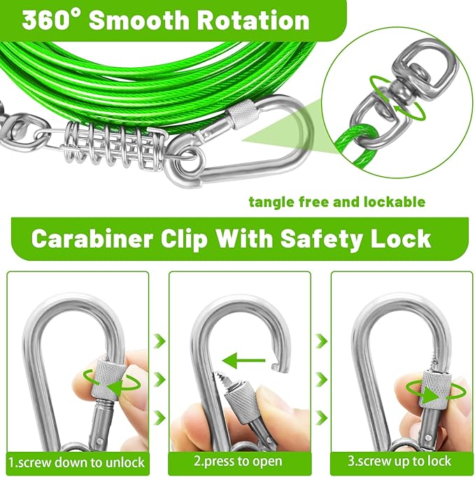 - THE NEWTEST CLIP: The rotating clip can rotate 360 ยฐ, and the clip is fixed with a ring at the bottom,so that the dog leash will not fall off the hook easily. Provide more space for dogs to move without entanglement. The screw on the swivel hook can lock it to prevent your pet from escaping from the cable and running to dangerous places. pet from breaking free of the cable and running into harm's way.