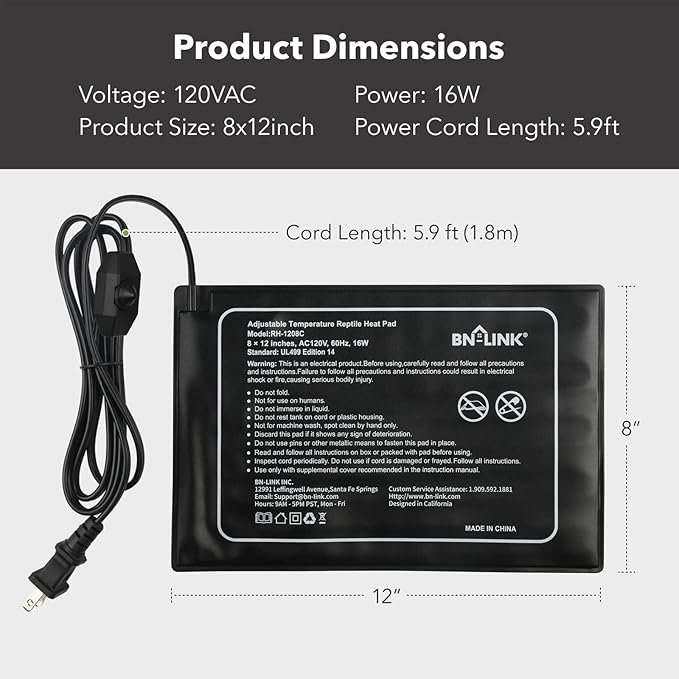 - MADE FOR REPTILES: Voltage: 120 volt, Power: 16 watt. The 8" x 12" model is perfect for a 10 -20 gallon terrarium and it can easily put out steady heat between 104โ and 122โ. Each unit comes with BN-LINKโs strong 15-month warranty.