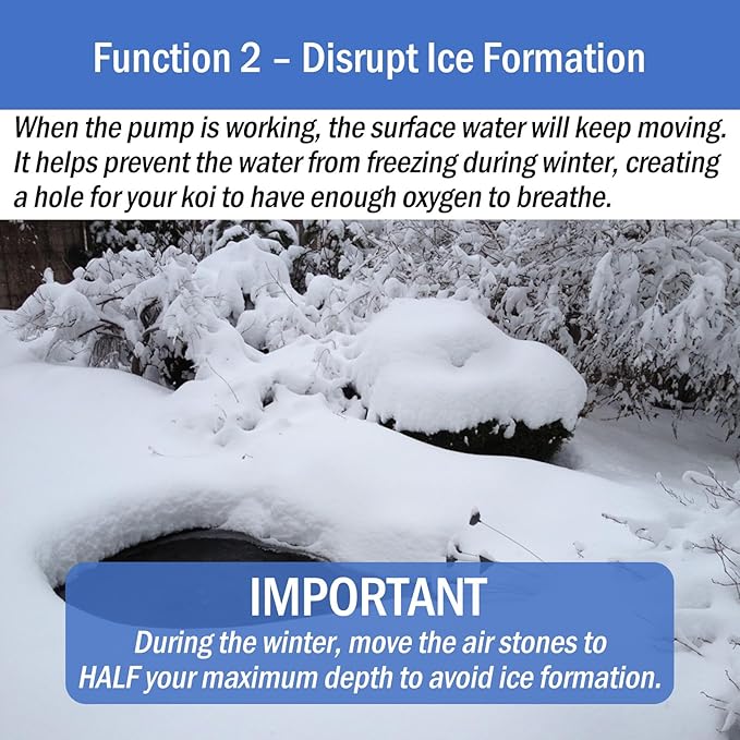 - DUAL-FUNCTIONAL - This pond air pump can not only work as a pond aerator, but also helps prevent ice formation in the cold winter months, ensuring your koi have a ventilation hole for breathing!
