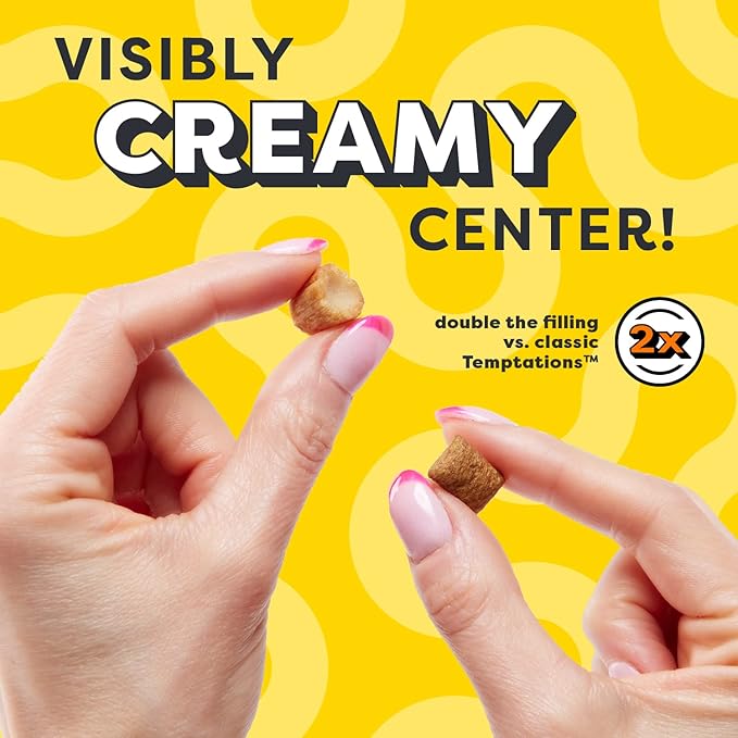 - Crunchy Outside, Creamy Inside: These irresistible cat treats have a visible soft center wrapped in a crunchy shell and have 2x more creamy filling than Classic Temptations Cat Treats