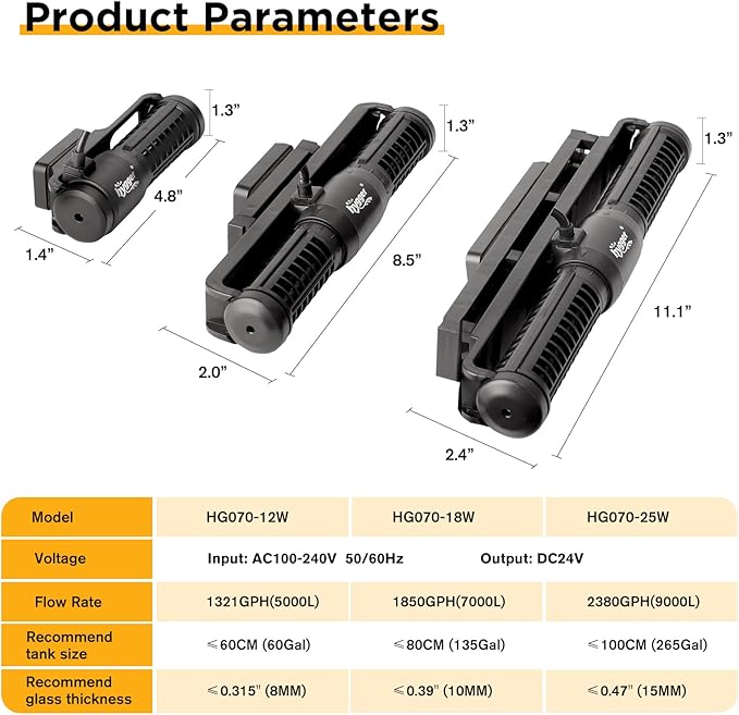 - ๐ SUITABLE FOR FISH TANKS UP TO 265 GALLONS: 11.1 inches long, 2.4 inches diameter, maximum power: 25W, maximum flow rate: 2380 GPH, suitable for up to 265 gallons of freshwater and marine aquariums. Its rotatable head generates waves from multiple directions, making it perfect for creating a natural environment for aquatic organisms.