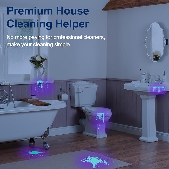 - 【Make Your Cleaning Easier】No longer need to clean your carpets blindly, blacklight flashlights could exactly detect food stains, bed bugs, pet urine stains and more invisible stains on your carpet, bathroom, furniture, or kitchen wall. No more paying for professional cleaners. Recommend pairing it up with carpet cleaning products.