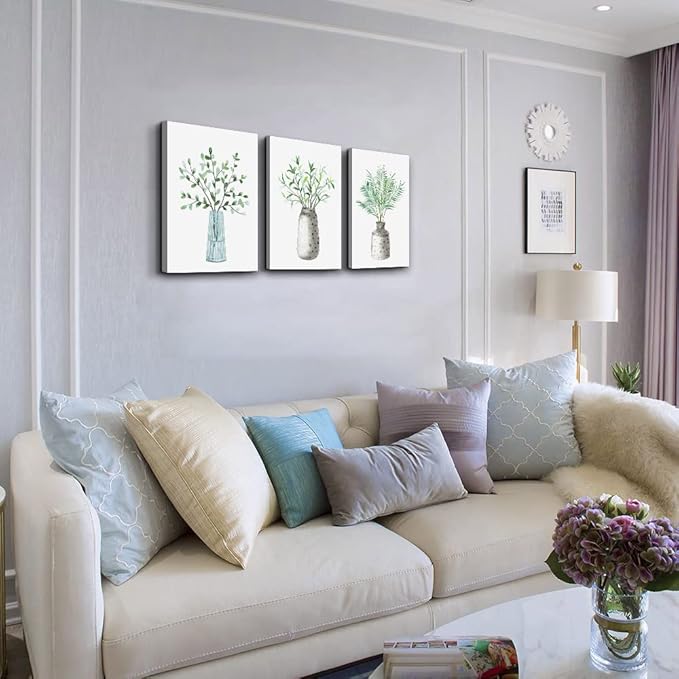 AHUASJART Canvas Wall Art - Paintings for Kitchen, Dining Room, Family Wall Decor - Green Leaf Vase, 3 Piece