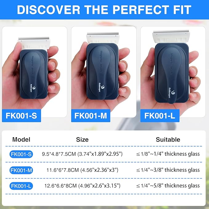 - Super Strong Magnetic Force for Quick Aquarium Cleaning: Our fish tank magnetic brush features a strong magnetic force that securely adsorbed to tanks without the risk of detachment. Designed to fit aquariums with a thickness of 1/4" ~ 3/8"(0.25-0.375in) inches, whether you're removing stubborn dirt or adjusting aquatic plants, our aquarium glass cleaner stays securely in place, making your cleaning tasks more efficient and effortless