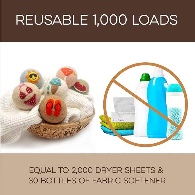 - REUSABLE FOR 1000+ LOADS โ REDUCE WASTE: Why keep buying disposable dryer sheets? These cute dryer balls last 1000+ loads, replacing 2000 dryer sheets or 30 bottles of fabric softener. Fluff Ewes dryer wool balls laundry reusable deliver a cost-effective solution for 2-4 years of hassle-free laundry. Make a smarter choice for your wallet and the environment.