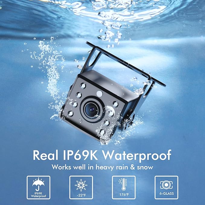 - 【Multi-function Truck Backup Camera】Image flip is perfect for reversing, no need to turn around all the time. Customize your viewing experience with adjustable brightness, contrast, and saturation settings. IP69 waterproof standard makes it to work in bad weather, resistant to heat and cold weather.