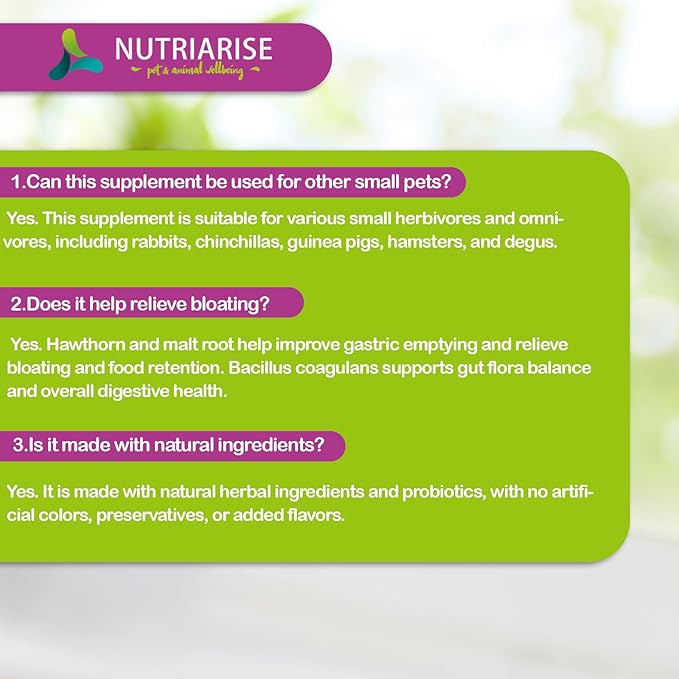 - ✅ 【HIGH FIBER DIGESTIVE SUPPORT FOR RABBITS】 NUTRIARISE Digestive Supplement provides essential digestive support for rabbits with a rich blend of soluble and insoluble fibers. Designed to prevent GI stasis, promote healthy intestinal motility, and maintain gut balance, it's ideal for rabbits, guinea pigs, and other small herbivores.