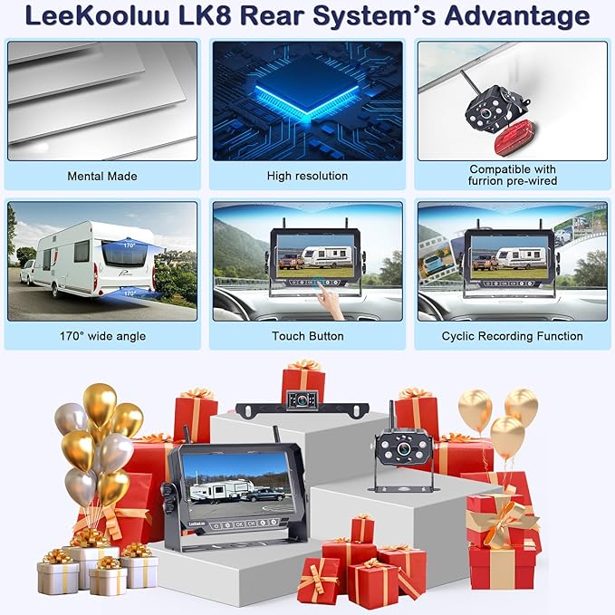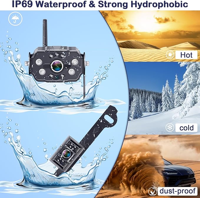 - 100% Waterproof: The backup camera for rv utilizes the latest nano-coating sealing technology with IP69 grade waterproof performance, which can work perfectly and provide clear images in extreme environments from -22ยฐF to 176ยฐF. This rv camera system wireless is like a brave guardian from any water or fine particles, tenaciously resisting wind, rain, dust, high and low temperatures, which enhances the safety index and strengthens the service life, providing a safer guarantee for driving.