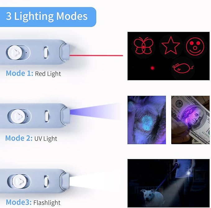 - 【3+5 Light Modes Dog Laser Pointer】This interactive cat toys for indoor cats has 3 light modes and 5 red laser patterns for option. 3 light modes (red light, uv light and flashlight), 5 different red laser patterns (red dot, mice, butterfly, smile face, star) which can be easily switched by scrolling buttons on handle. This cat toys laser pointer can meet different cats dogs pets play& training games needs,check pets ringworm and owner daily use(like PPT working,night lighting...).