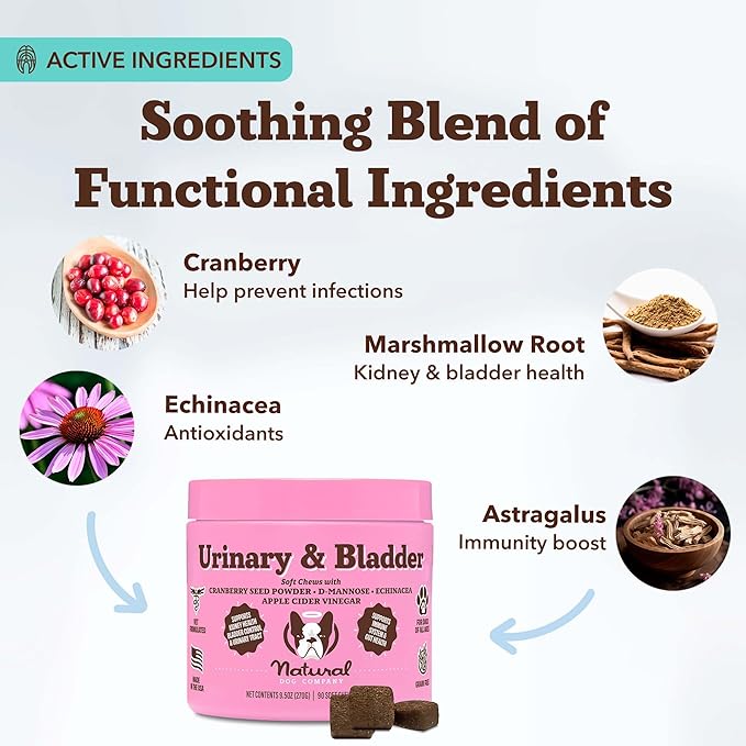- OPTIMAL BLADDER HEALTH: Ensure your petโs comfort and happiness with our Urinary and Bladder Soft Chews. These chews provide superior bladder control for dogs and support the entire urinary tract for dogs, helping to reduce discomfort and improve daily life. Trust in our natural formula to keep your dog's bladder health in check and their spirits high.