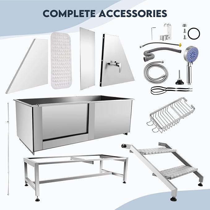 - ❄️Well made stainless steel material:The pet grooming bath tub can accommodate various sizes of dogs and perform long-lasting use due to its high grade stainless steel material.