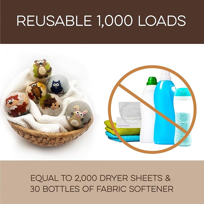 - REUSABLE FOR 1000+ LOADS โ REDUCE WASTE: Why keep buying disposable dryer sheets? These cute dryer balls last 1000+ loads, replacing 2000 dryer sheets or 30 bottles of fabric softener. Fluff Ewes dryer wool balls laundry reusable deliver a cost-effective solution for 2-4 years of hassle-free laundry. Make a smarter choice for your wallet and the environment.