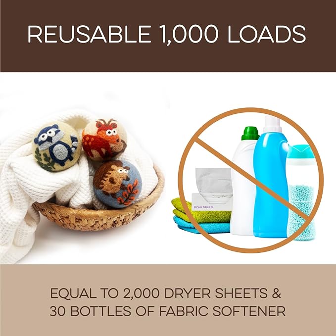 - REUSABLE FOR 1000+ LOADS โ REDUCE WASTE: Why keep buying disposable dryer sheets? These cute dryer balls last 1000+ loads, replacing 2000 dryer sheets or 30 bottles of fabric softener. Fluff Ewes dryer wool balls laundry reusable deliver a cost-effective solution for 2-4 years of hassle-free laundry. Make a smarter choice for your wallet and the environment.
